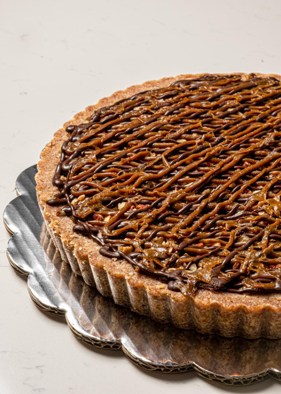 Deliciosa tarta congelada hecha a base de nuez tostada, coco y dátiles, con un relleno cremoso de nuez de la india, pedazos de plátano natural, cubierta de nuez pecana tostada, chocolate y caramelo de leche de coco.