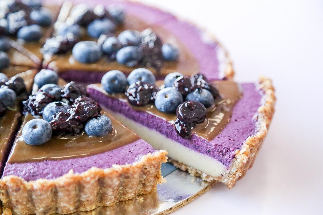 Deliciosa tarta CONGELADA hecha a base de nuez tostada, coco y dátiles, con un relleno cremoso de nuez de la india, limón y mora azul, decorado con nuestra mermelada artesanal y moras.