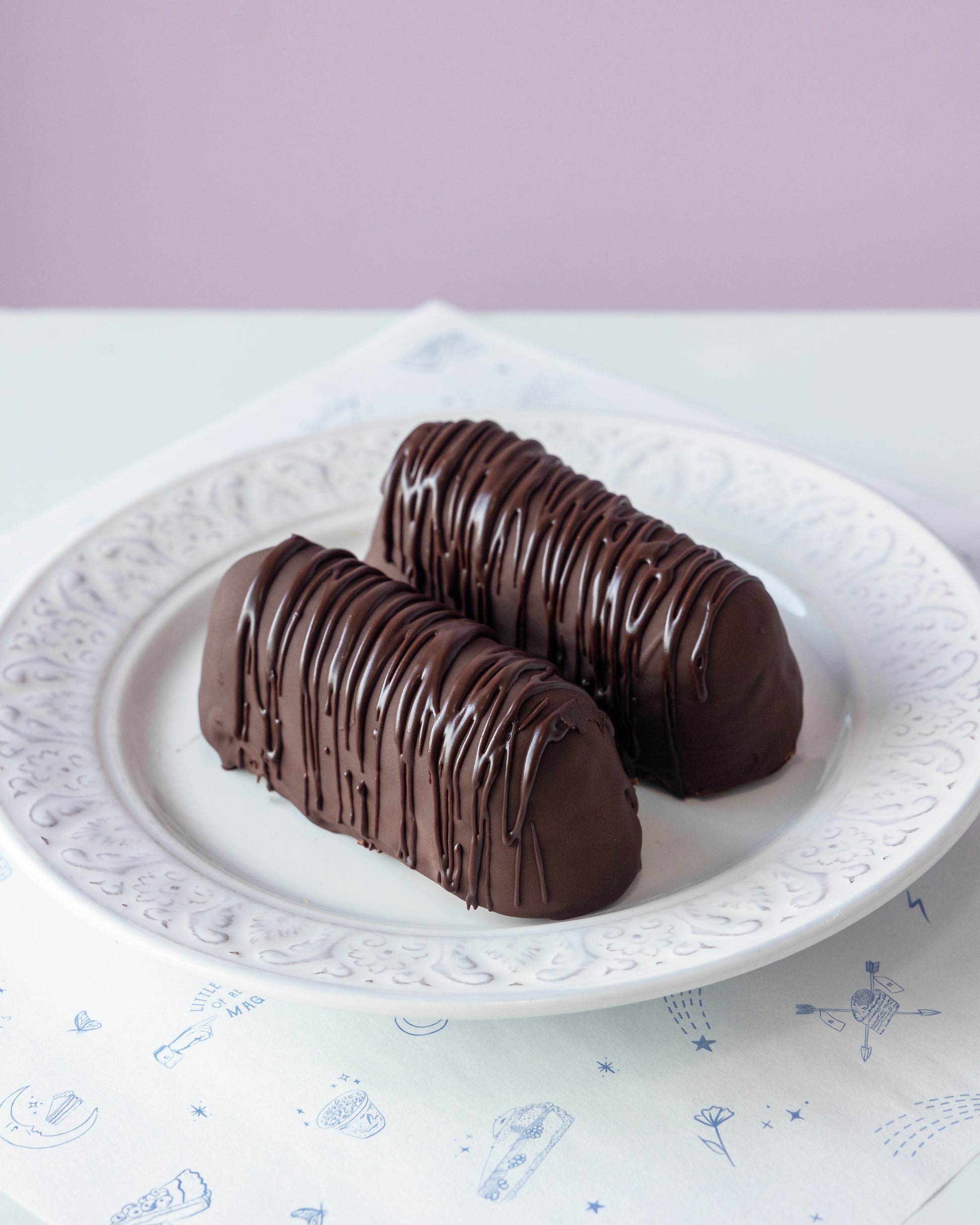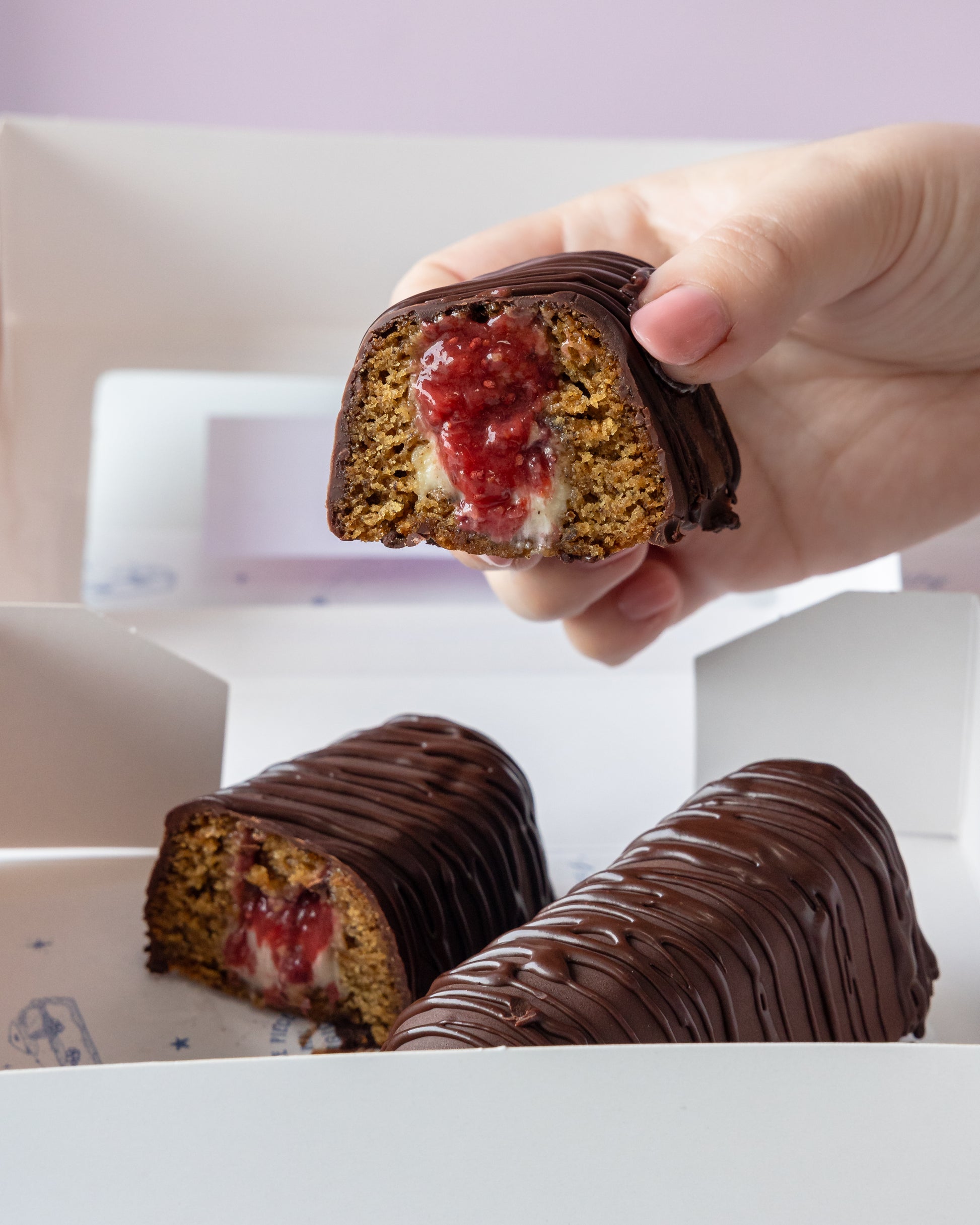 Delicioso pastelito de vainilla con relleno cremoso de vainilla y mermelada de fresa con cobertura crocante de chocolate.