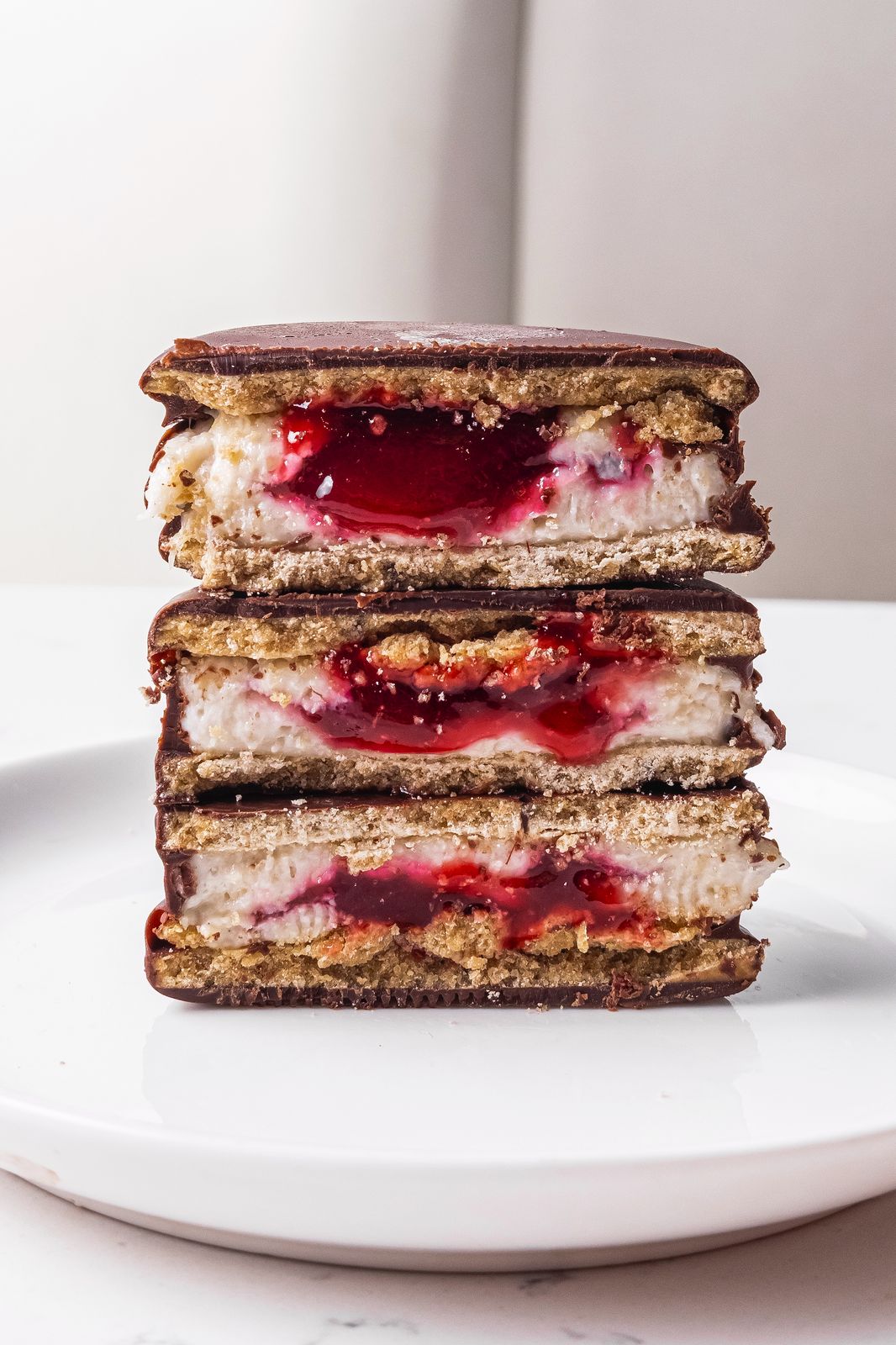 Sandwich de crujientes galletas de vainilla con málvavisco vegano, relleno de mermelada fresca de frambuesa y cubierto de chocolate oscuro.