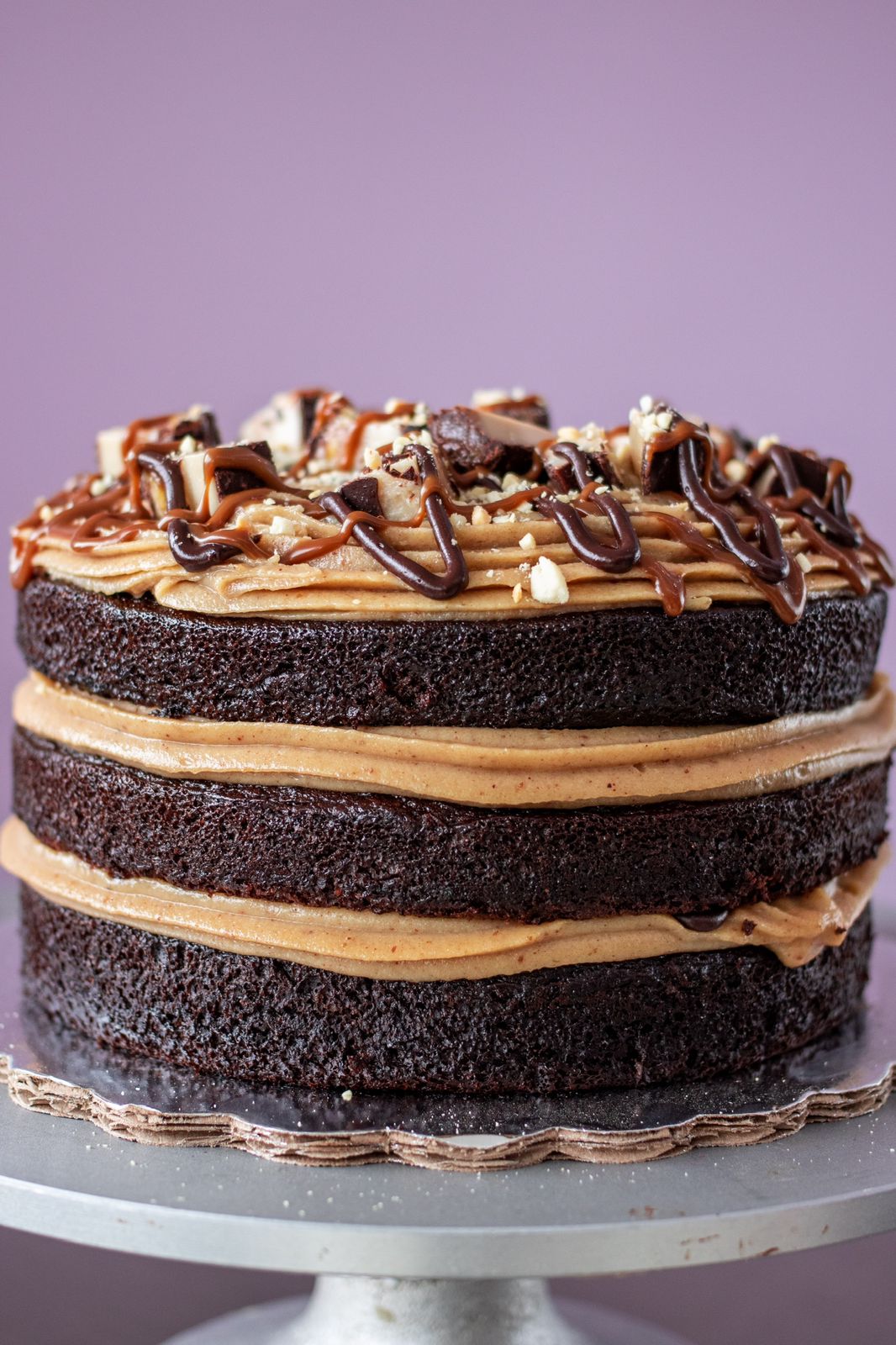 Pan de chocolate relleno de un delicioso betún de caramelo con trozos de nuestro chocolate (estilo snickers) con caramelo y cacahuate salado.